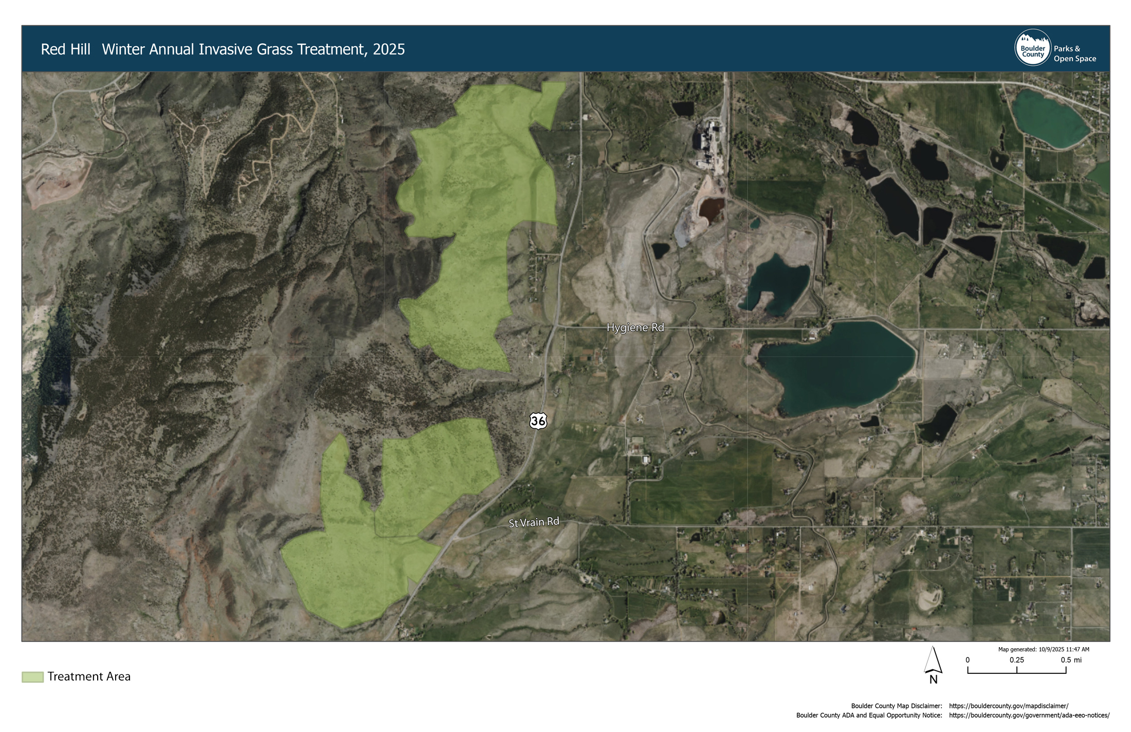 | 2025/05/1905/19/2025 | 2025/05/2305/23/2025 | Hall Ranch Quarry Site | No | Milestone | A drone herbicide application will be conducted during this timeframe by the managing contractors to fulfill state requirements for mine reclamation at the Hall Quarry Site before management of the site is transferred to Boulder County control. A drone application is preferred over other application methods for personnel safety and because drones operate 20 feet or less from the ground, move at slower speeds and in patterns, and can be programed to spray small, specific areas. | View Map |